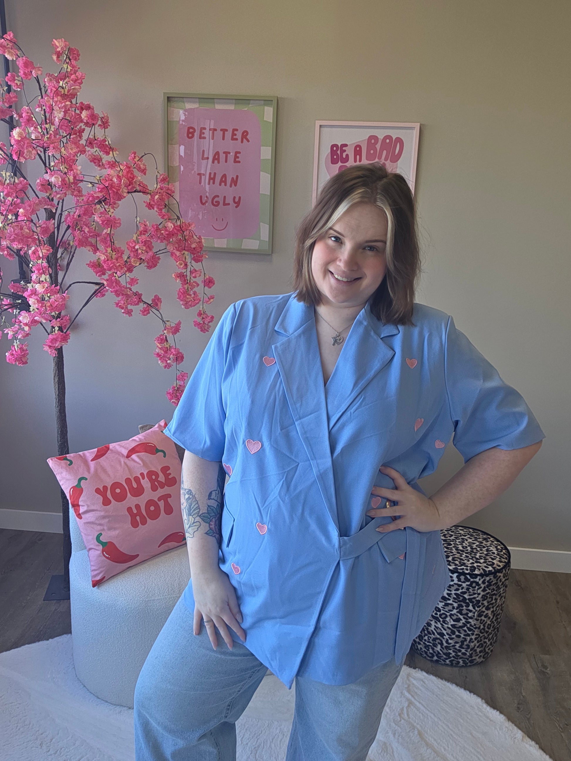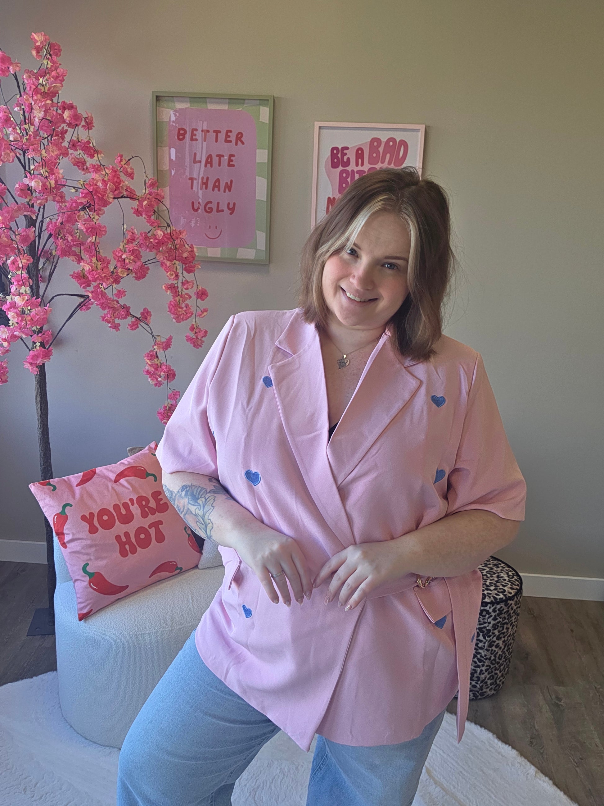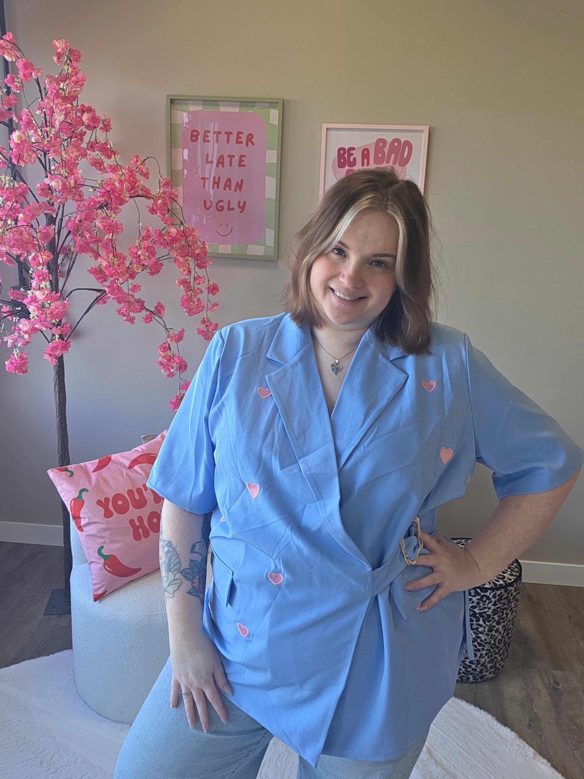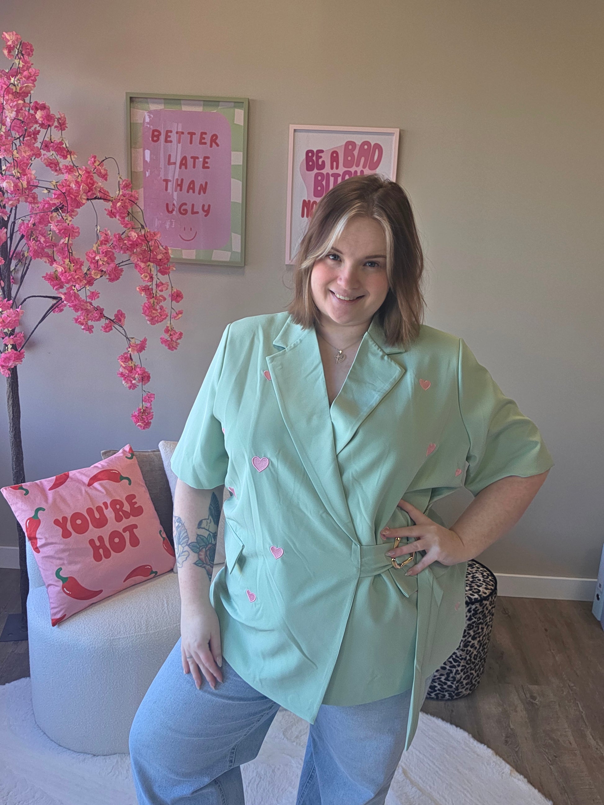 Deze hartje blazer is de perfecte mix van classy en cute. De subtiele hartjesdetails geven de blazer een speelse en unieke uitstraling, terwijl het model zorgt voor een krachtige en stijlvolle look.