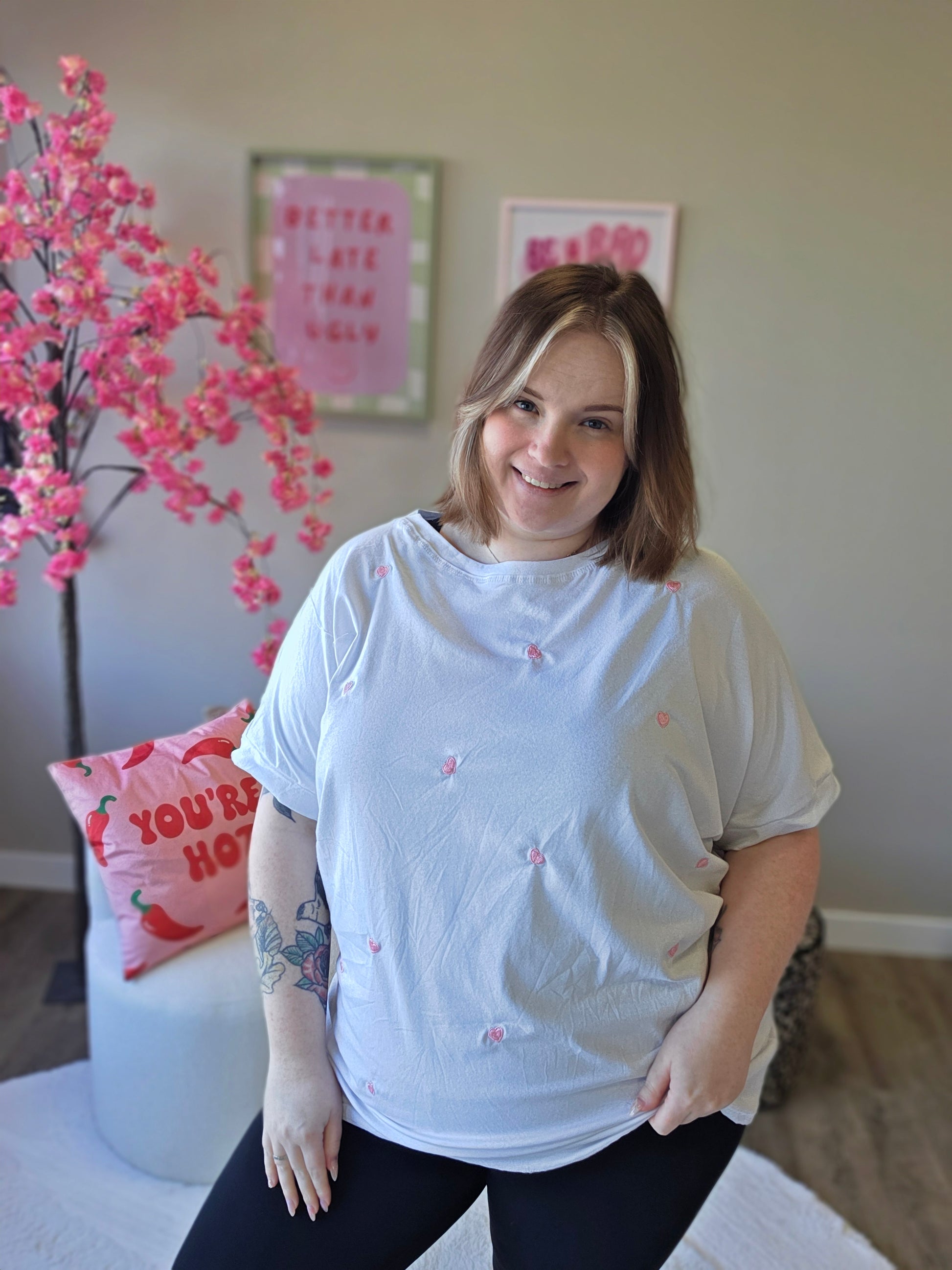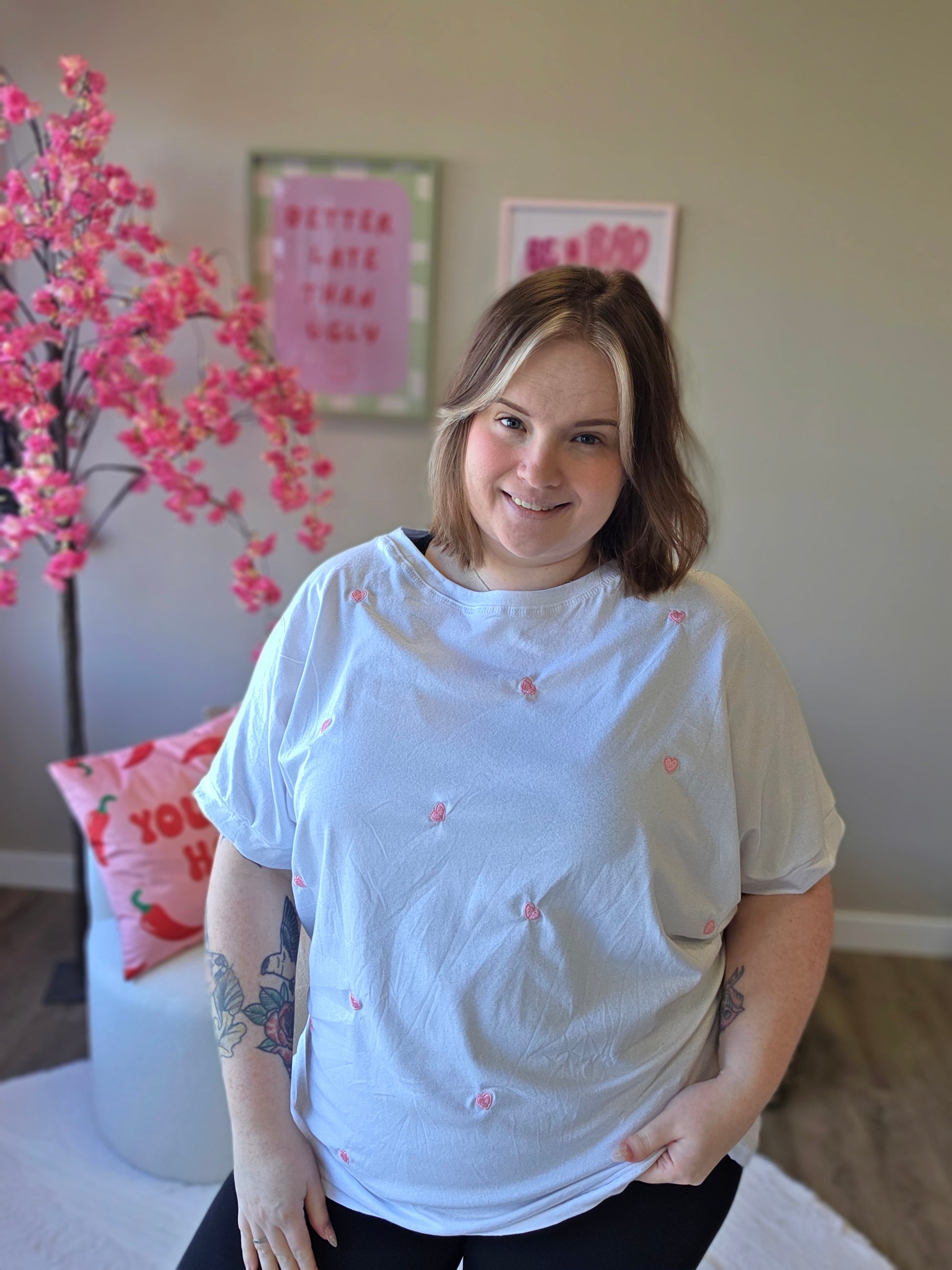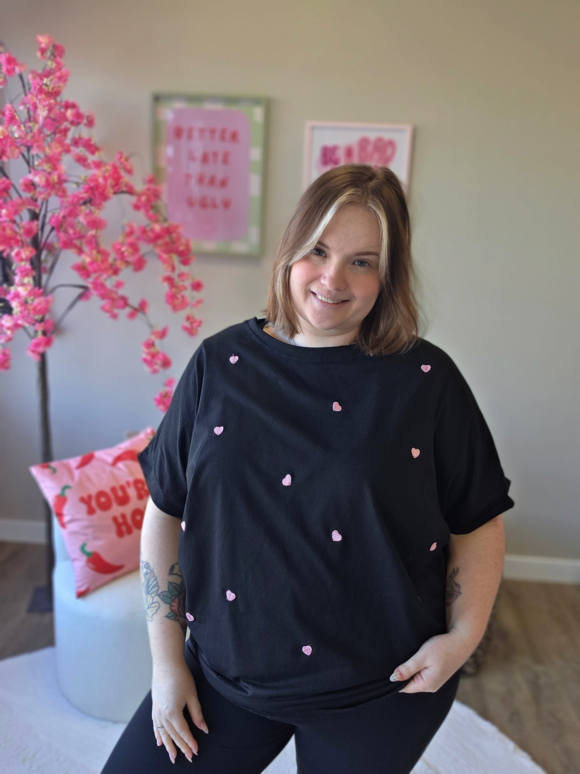 Dit T-shirt met geborduurde hartjes is de perfecte mix van simpel en super cute. De subtiele geborduurde hartjes geven het shirt een lieve en speelse uitstraling, terwijl de zachte stof zorgt voor ultiem draagcomfort.